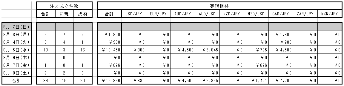 【トラリピ】2020年8月(第1週)の運用実績>実現損益約1.5万円 2020年08月08日 8月第1週(2020年8月3日~2020年8月8日)のトラリピ運用実績です(ここのところ相場がほとんど動かないので、8月第1週の運用実績をまとめてみました)。8月第1週の実現損益は16,846円。相場の動きが小さかった7月第2週の実現損益(15,559円)と同程度の運用実績です。ん~。ここのところ、ほんと値動きが小さいですねぇ。8月から秋にかけては一般的に相場が荒れやすいとされているようですので、来週に期待! < 前の記事次の記事 >
