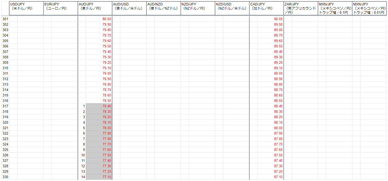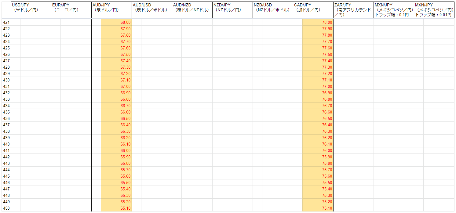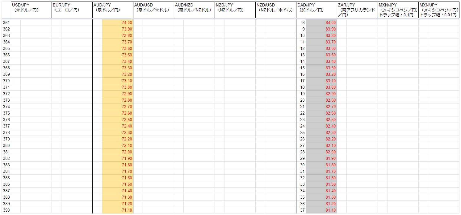 メインの運用(8通貨ペア)は、AUD/JPY、AUD/USDが設定レンジを下抜けしています。CAD/JPYも設定レンジを下抜けしそうな勢いで下落した局面がありました。