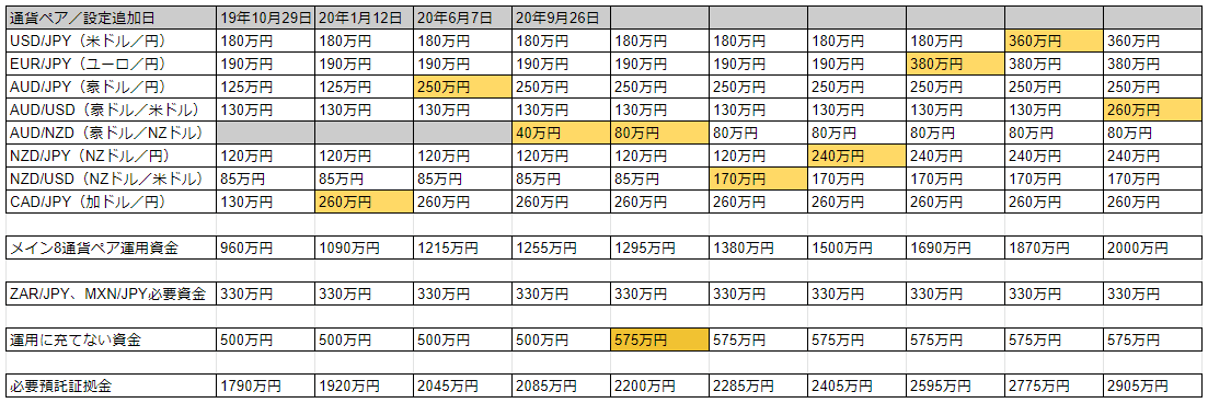 トラリピ運用試算表によるレンジ端に達した場合の必要資金を元に2000万円を按分し、各通貨ペアの運用資金を見直しました。