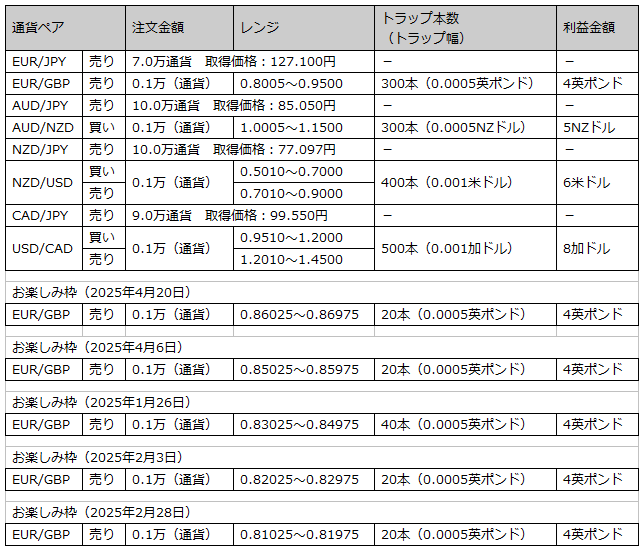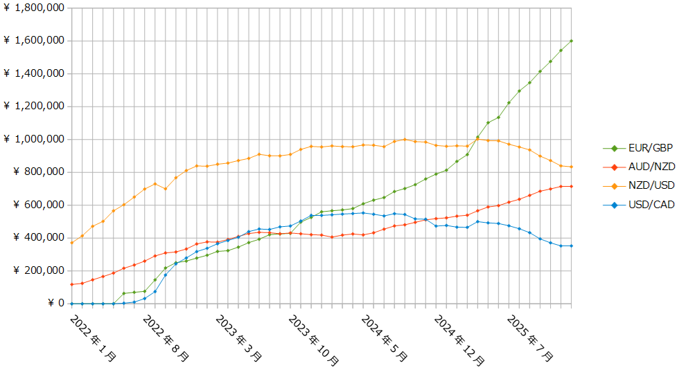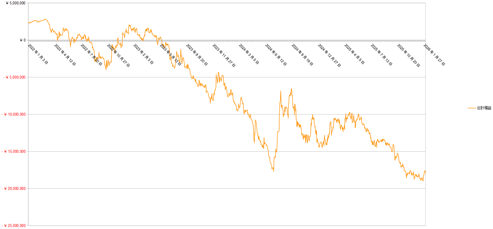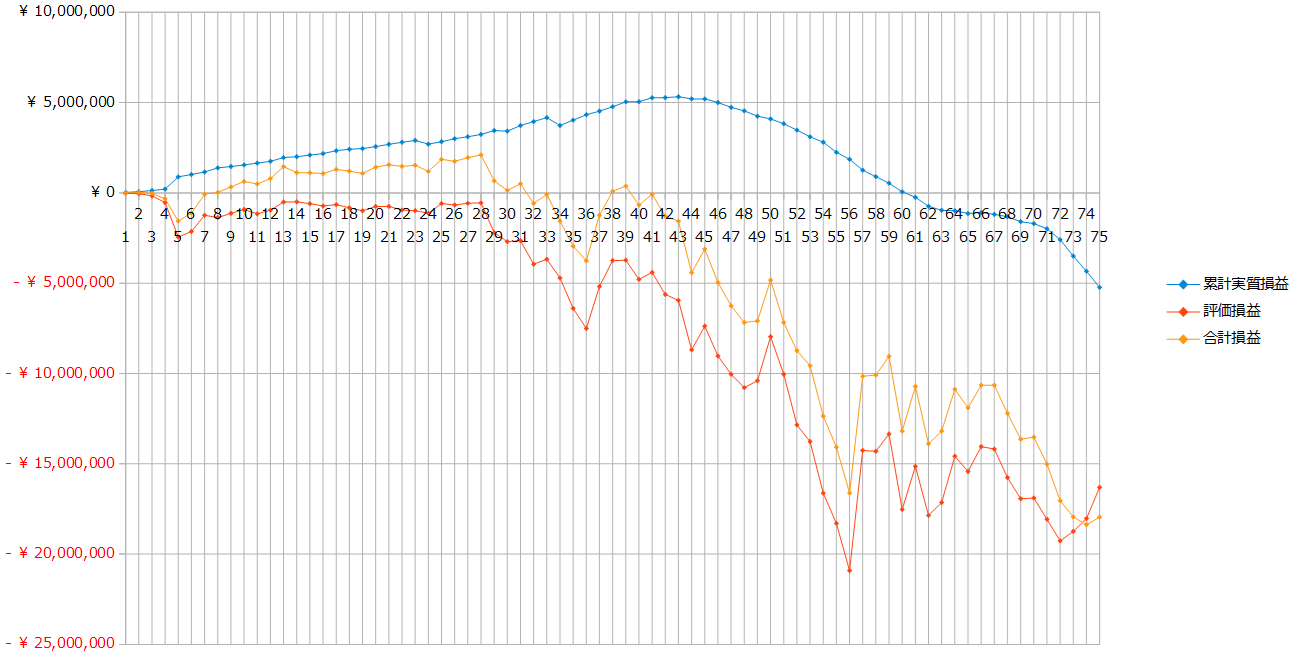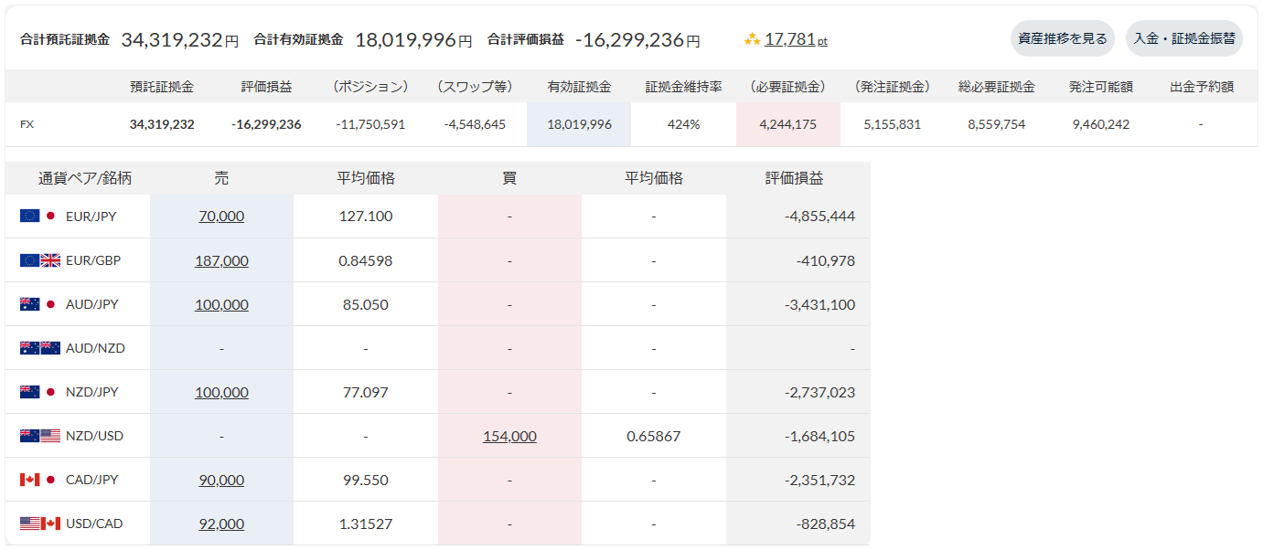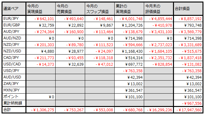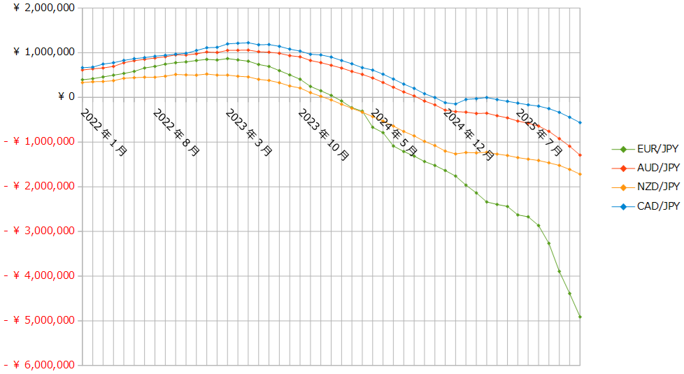 【トラリピ】2026年1月(4週間分)の運用実績>実質損益-895,676円 2026年02月01日 2026年1月(1月4日~1月31日:4週間分)のトラリピ運用実績です。1月8日、23日にクロス円の通貨ペアのポジションを20本ずつ落とし、705,320円の売買損が生じたので、それを除いた今月の実質損益は-57,901円です。未実現スワップ考慮前未実現スワップ考慮後集計時点の預託証拠金ベースで集計しています。未実現スワップ考慮前の金額は、トレード画面(口座状況)の金額と一致しています。合計損益は税引き後、実現損益(実質損益)は税引き前の金額です。累計の実質損益=累計の実現損益+未実現スワップ今月の実質スワップ損益=未実現スワップ-先月末の未実現スワップ+今月のスワップ損益今月の実質損益=今月の売買損益+今月の実質スワップ損益2026年1月の合計損益の推移2022年1月以降の合計損益の推移実質損益の推移(累計)累計実質損益の推移(クロス円)累計実質損益の推移(クロス円以外)2026年1月末(2026年1月31日)の口座状況2026年1月末の注文状況トラリピさん、来月もよろしくお願いします。 < 前の記事次の記事 >