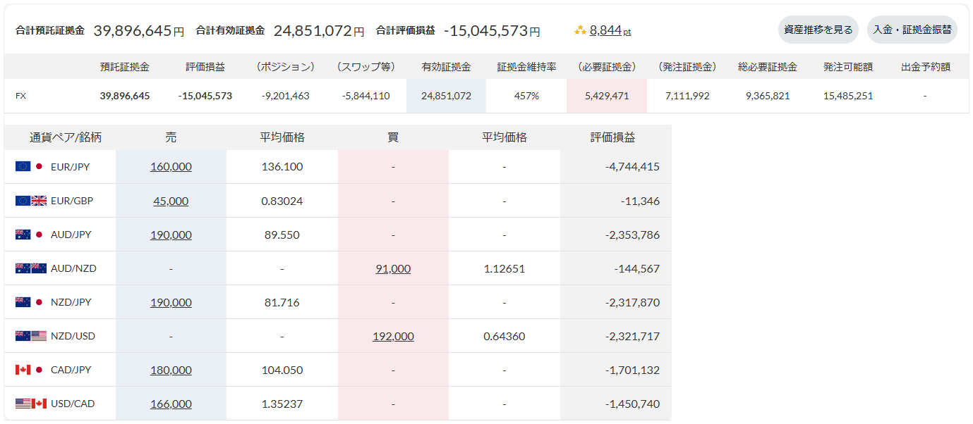 現在の合計損益は-11,116,484円、評価損益は-9,201,463円、証拠金維持率は457%です。