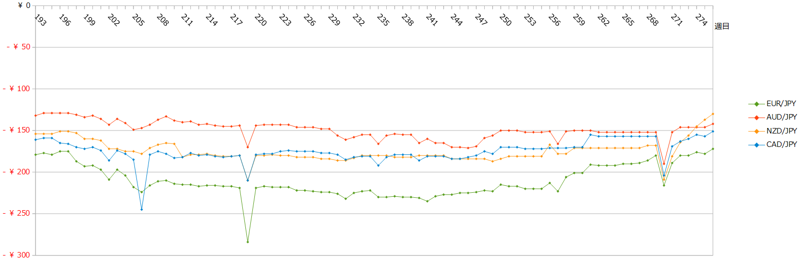 クロス円の通貨ペアのマイナススワップもジリジリ小さくなってきています。