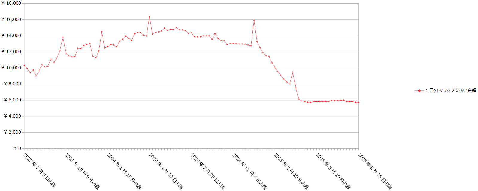 クロス円の通貨ペアのスワップ支払い金額は、現在1日5,727円です。