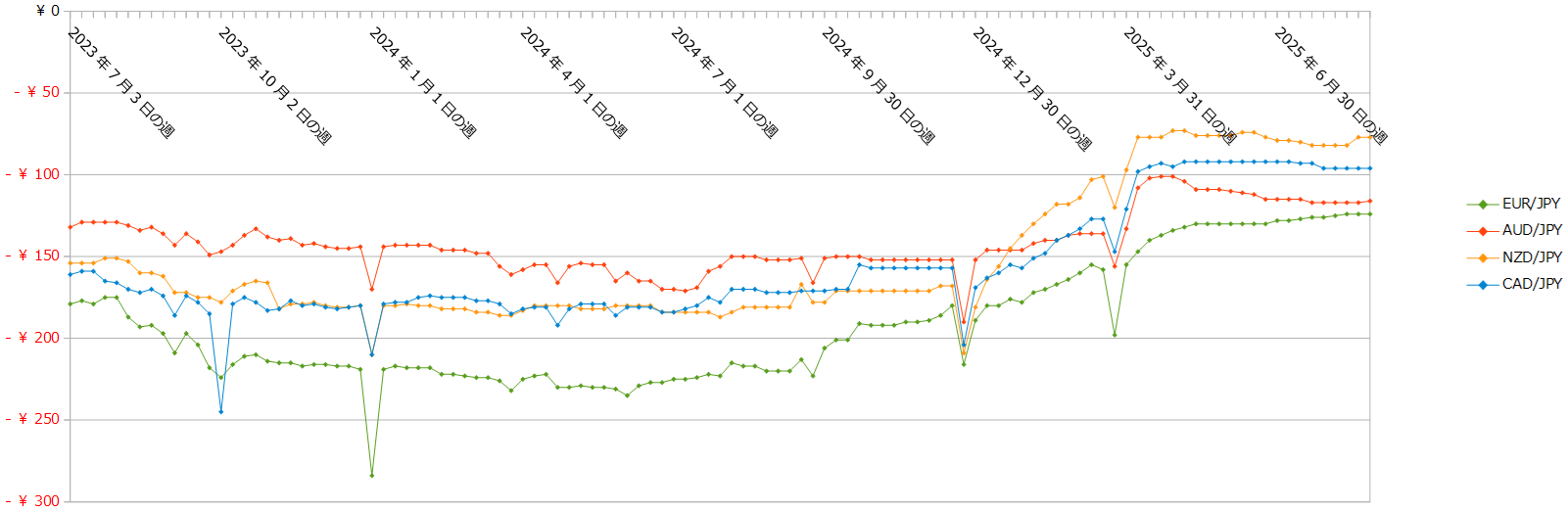 クロス円の通貨ペアのスワップの推移(2023年7月3日の週以降)