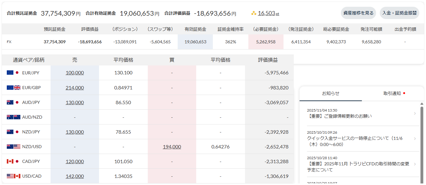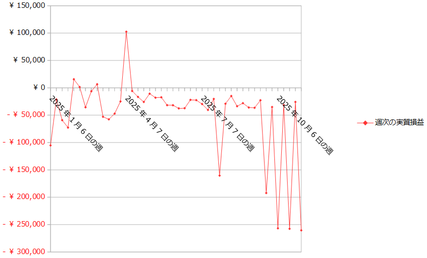 11月6日にクロス円の通貨ペアのポジションを20本落とし、232,569円の売買損が生じたので、それを除いた今週の実質損益は-27,882円です。