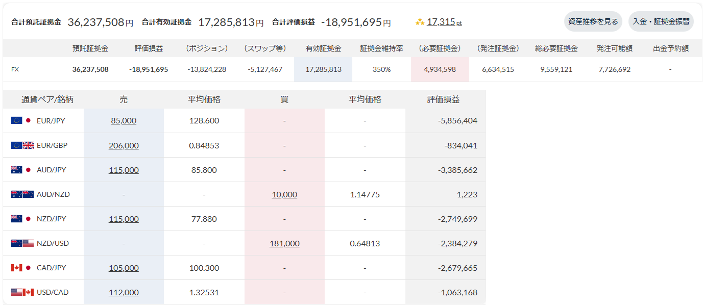 現在の合計損益は-18,681,743円、評価損益(ポジション)は-13,824,228円、証拠金維持率は350%です。