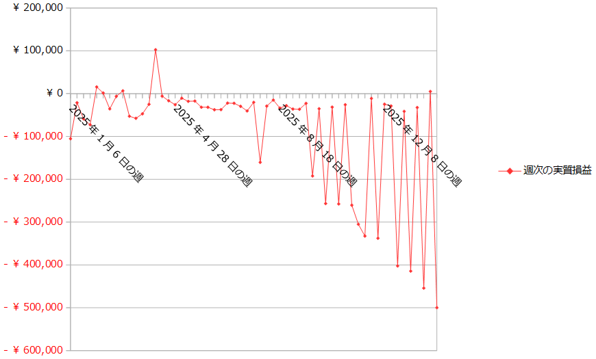2月7日にクロス円の通貨ペアのポジションを20本落とし、482,870円の売買損が生じたので、それを除いた今週の実質損益は-16,899円です。