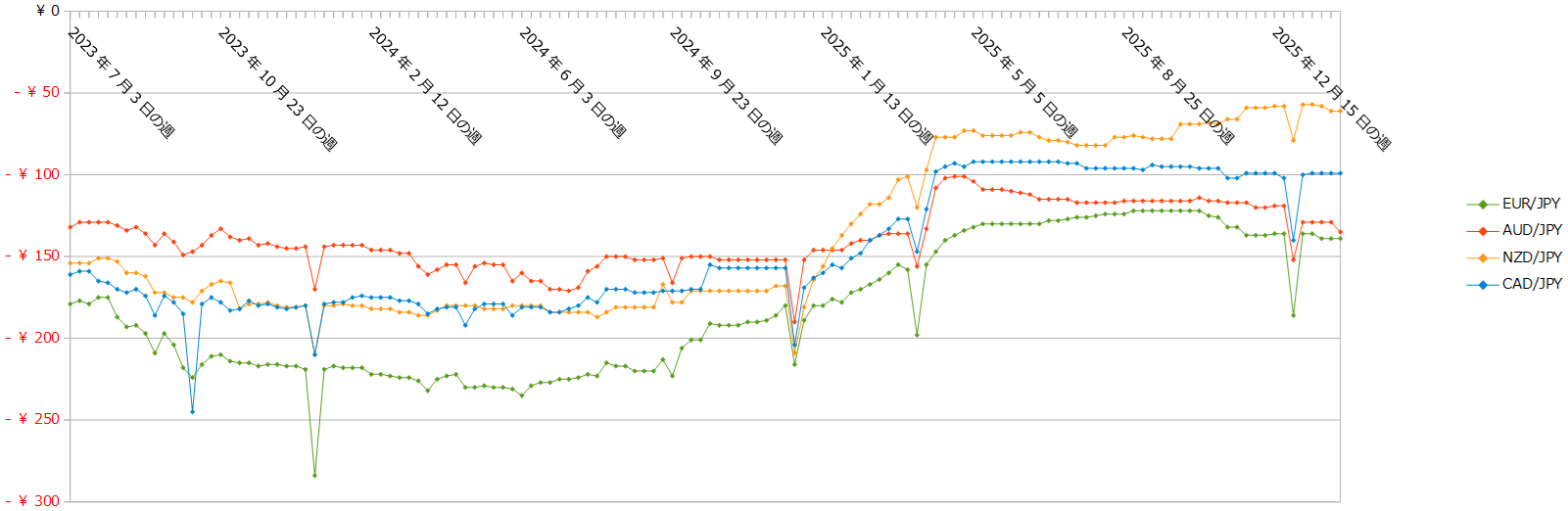 クロス円の通貨ペアのスワップの推移(2023年7月3日の週以降)