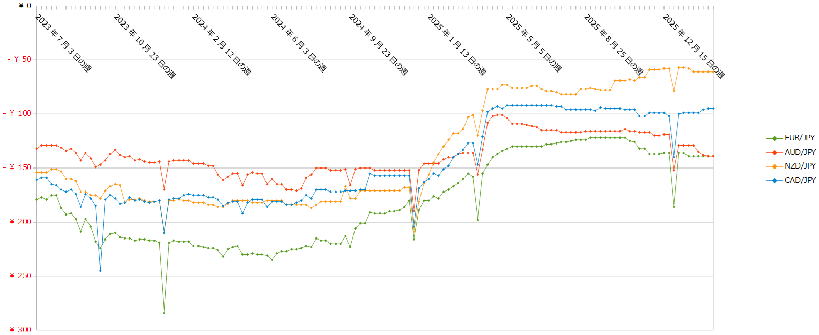 クロス円の通貨ペアのスワップの推移(2023年7月3日の週以降)