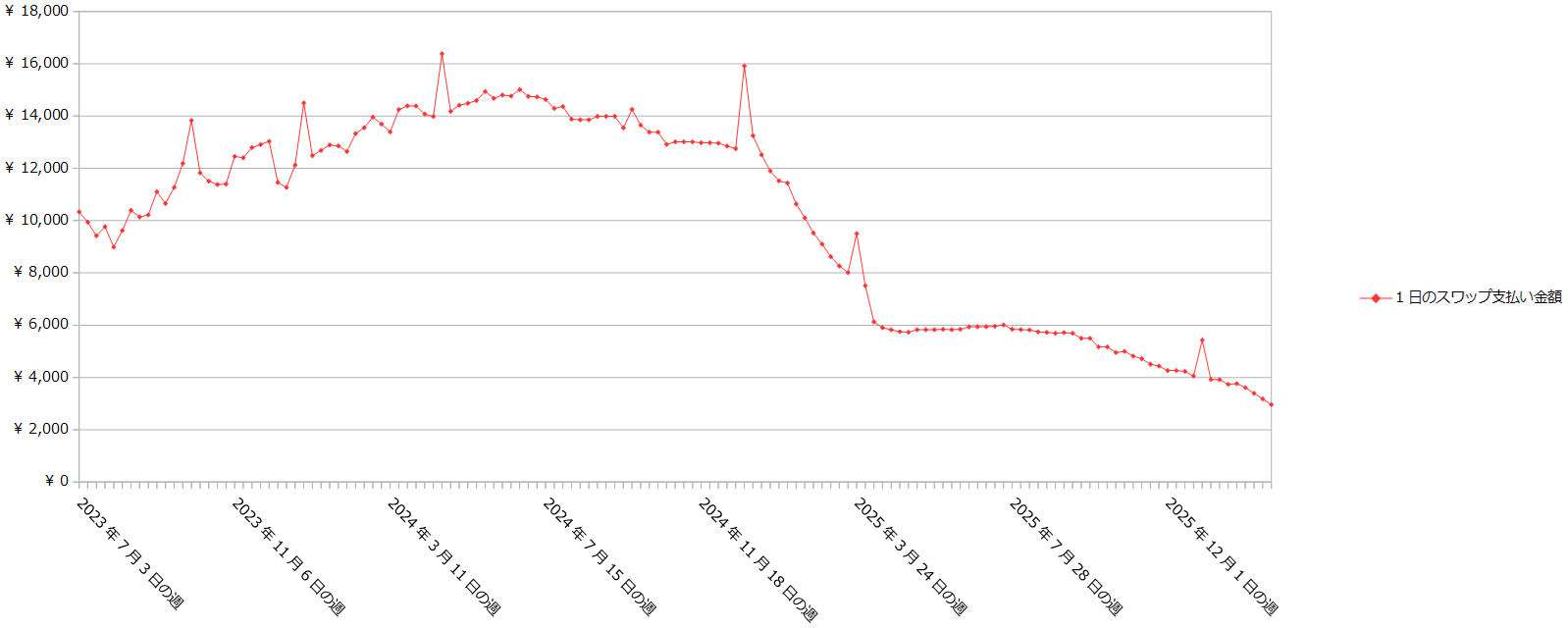 クロス円の通貨ペアのスワップ支払い金額は、現在1日2,960円です。
