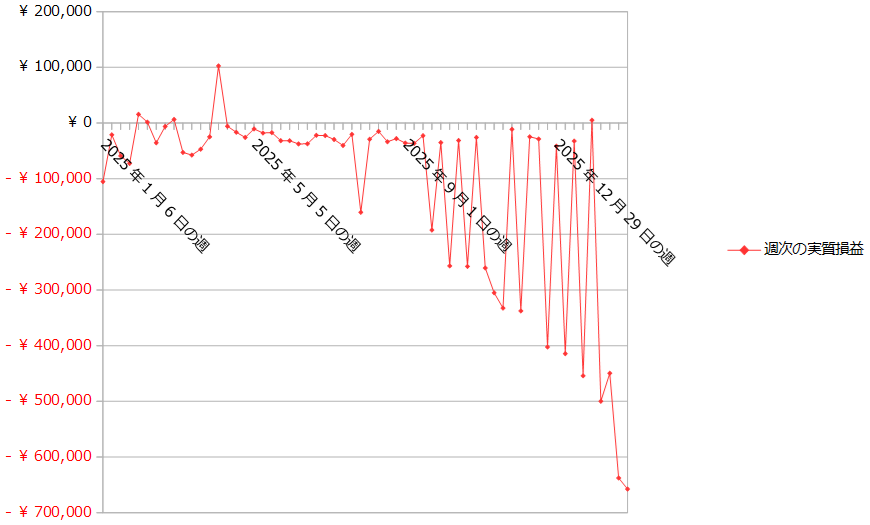 2月28日にポジションを30本落とし、634,739円の売買損が生じたので、それを除いた今週の実質損益は-22,696円です。